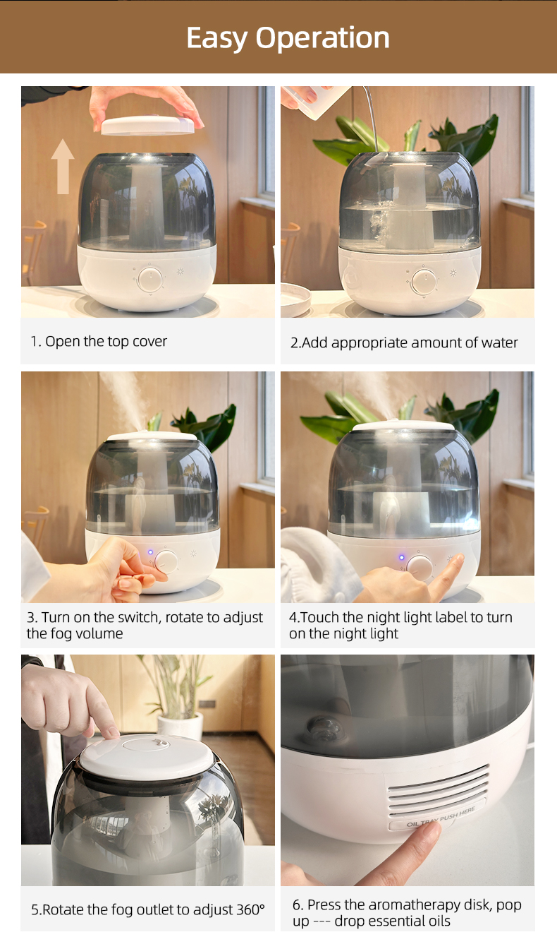 Meie uus ultraheli aroomiteraapiline õhuniisutaja, suur 5-liitrine elektriline kodukasutus muudab teie kasutamise turvalisemaks ja intiimsemaks. See on pehmem kui tavalised õhuniisutajad ning ei sega teie õppimist, tööd ega puhkust. Veepaagi ülaosa täitmine, mugav ja kiire, läbipaistev veepaak, veetase näha. Nano-peen udu 300 ml/h, maksimaalne udu võib töötada 8 tundi, minimaalne udu võib töötada 50 tundi, võib lisada aroomiteraapiat, et rahustada teie tuju. Niisutaja korpus on varustatud sõltumatu öövalgusega, et teie öö oleks täis turvalisust.